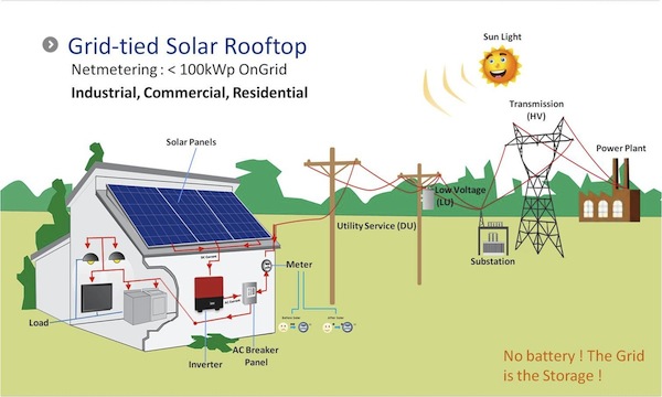 Grid Tie solar power systems use solar modules to generate solar power. An inverter synchronizes the power from the solar array with the power coming from the grid off-setting the amount of power you are taking from the grid. If you are using less energy than you are generating the extra energy goes onto the grid and your meter records the surplus. If you use more power than you are generating at a later time, the amount of energy you contributed to the grid will off-set your next power bill.